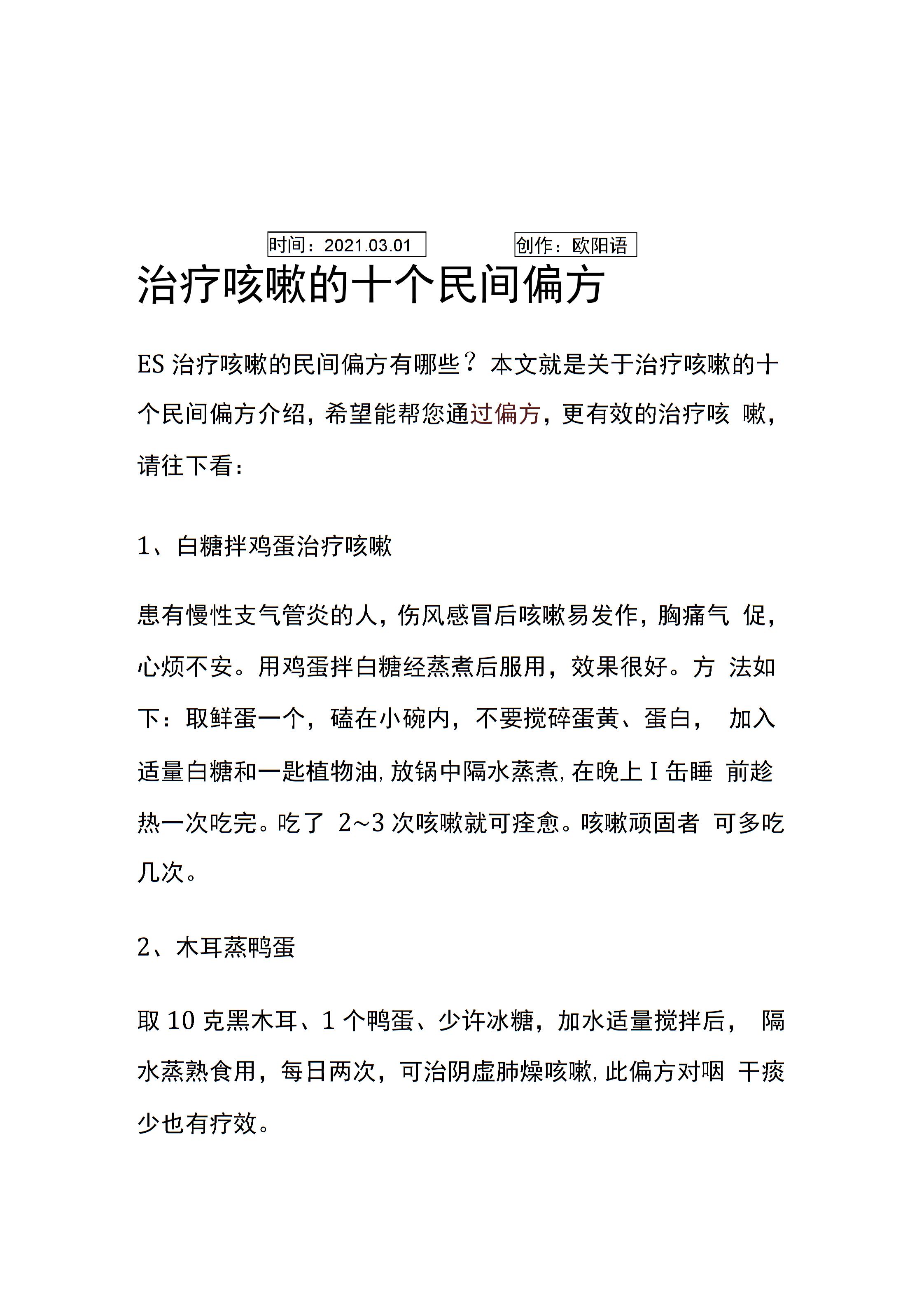 治疗咳嗽的十个民间偏方时间:2021.03.01创作:欧阳语ES治疗咳嗽的民间偏方有哪些?本文就是关于治疗咳嗽的十个民间偏方介绍,希望能帮您通过偏方,更有效的治疗咳嗽,请往下看:1、白糖拌鸡蛋治疗咳嗽患有慢性支气管炎的人,伤风感冒后咳嗽易发作,胸痛气促,心烦不安。用鸡蛋拌白糖经蒸煮后服用,效果很好。方法如下:取鲜蛋一个,磕在小碗内,不要搅碎蛋黄、蛋白,加入适量白糖和一匙植物油,放锅中隔水蒸煮,在晚上I缶睡前趁热一次吃完。吃了2~3次咳嗽就可痊愈。咳嗽顽固者可多吃几次。2、木耳蒸鸭蛋取10克黑木耳、1个鸭蛋、少许冰糖,加水适量搅拌后,隔水蒸熟食用,每日两次,可治阴虚肺燥咳嗽,此偏方对咽干痰少也有疗效。3、核桃、芝麻、生姜粉治疗咳嗽核桃5个,生芝麻25克,生姜25克,红糖适量。核桃和生芝麻捣成碎末,生姜去皮捣成碎末。集中放入碗内,加红糖搅拌均匀。每次取一汤勺(约30克),白开水冲服,每日早晩各服一次。4、梨汁炖冬菇治疗咳嗽梨能润肺凉心、消痰降火,冬菇内的双链糖核酸在人体内产生的干扰素能消灭体内的病毒。用〃梨汁炖冬菇〃的食疗法防治秋冬的燥咳,消除感染z一般服用两三天即见收效。偏方制法如下:先将4个鸭梨去皮切片榨成汁,把冬菇200克洗净切片,加适量水和冰糖同炖,等冬菇炖熟后,早晚分两次连汤同食,即可。