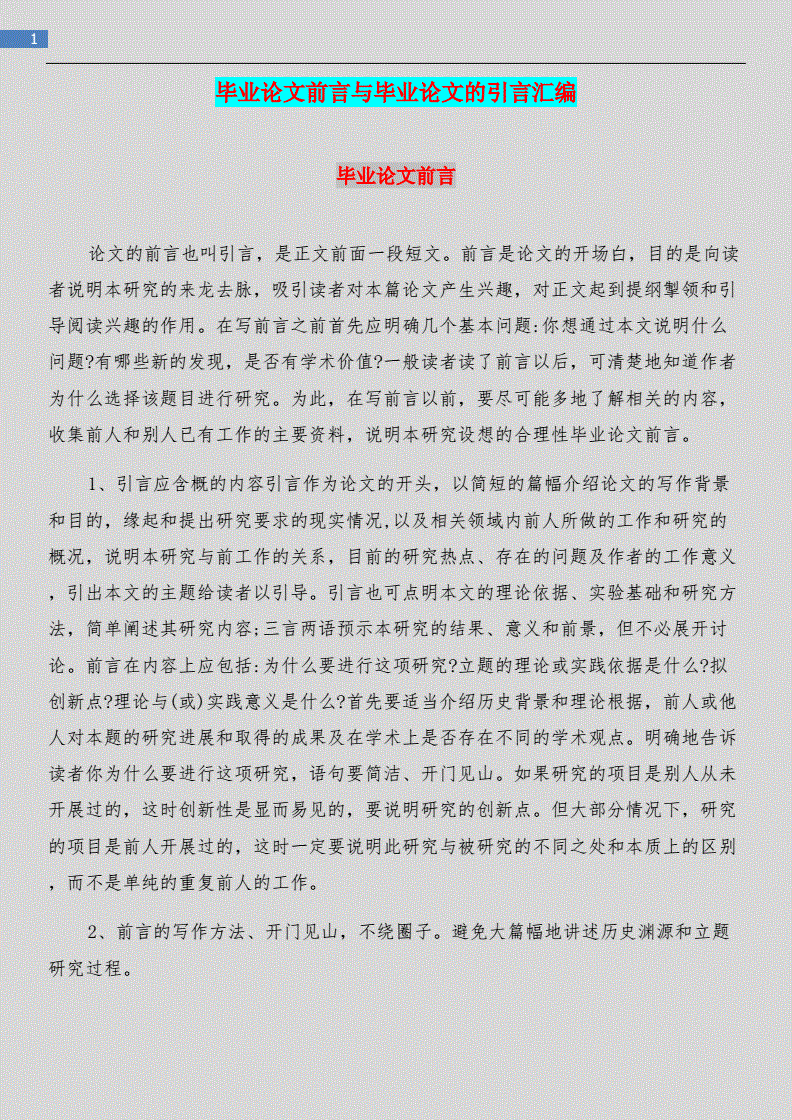 要求同学们学写综述,至多有以下好处:通过搜集文献材料过程,可进一步熟识科学文献的查找方法和材料的积累方法;在查找的过程中同时也扩大了学问面;而论文的前言也叫引言,是注释前面一段短文。前言是论文的开场白,目的是向读者说明本讨论的来龙去脉,吸引读者对本篇论文产生爱好,对注释起到提纲掣领和引导阅读爱好的作用。
