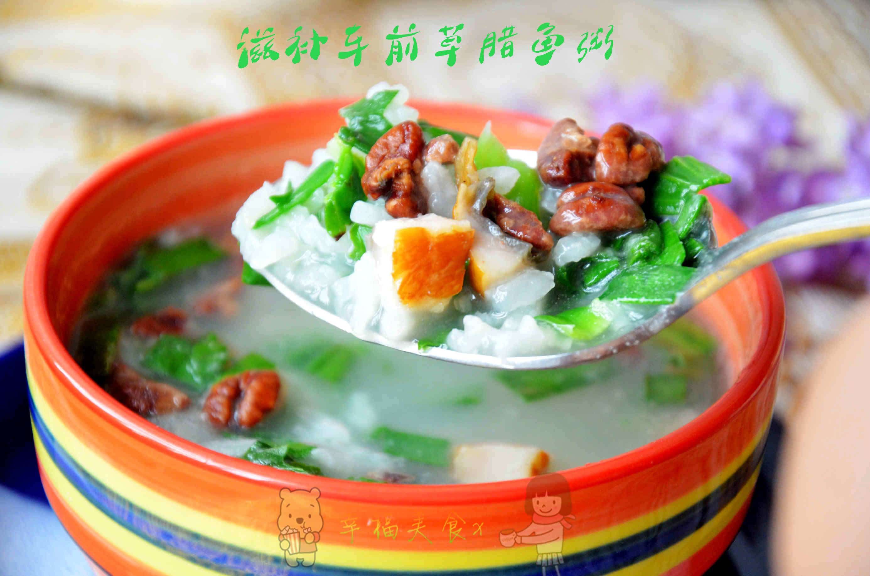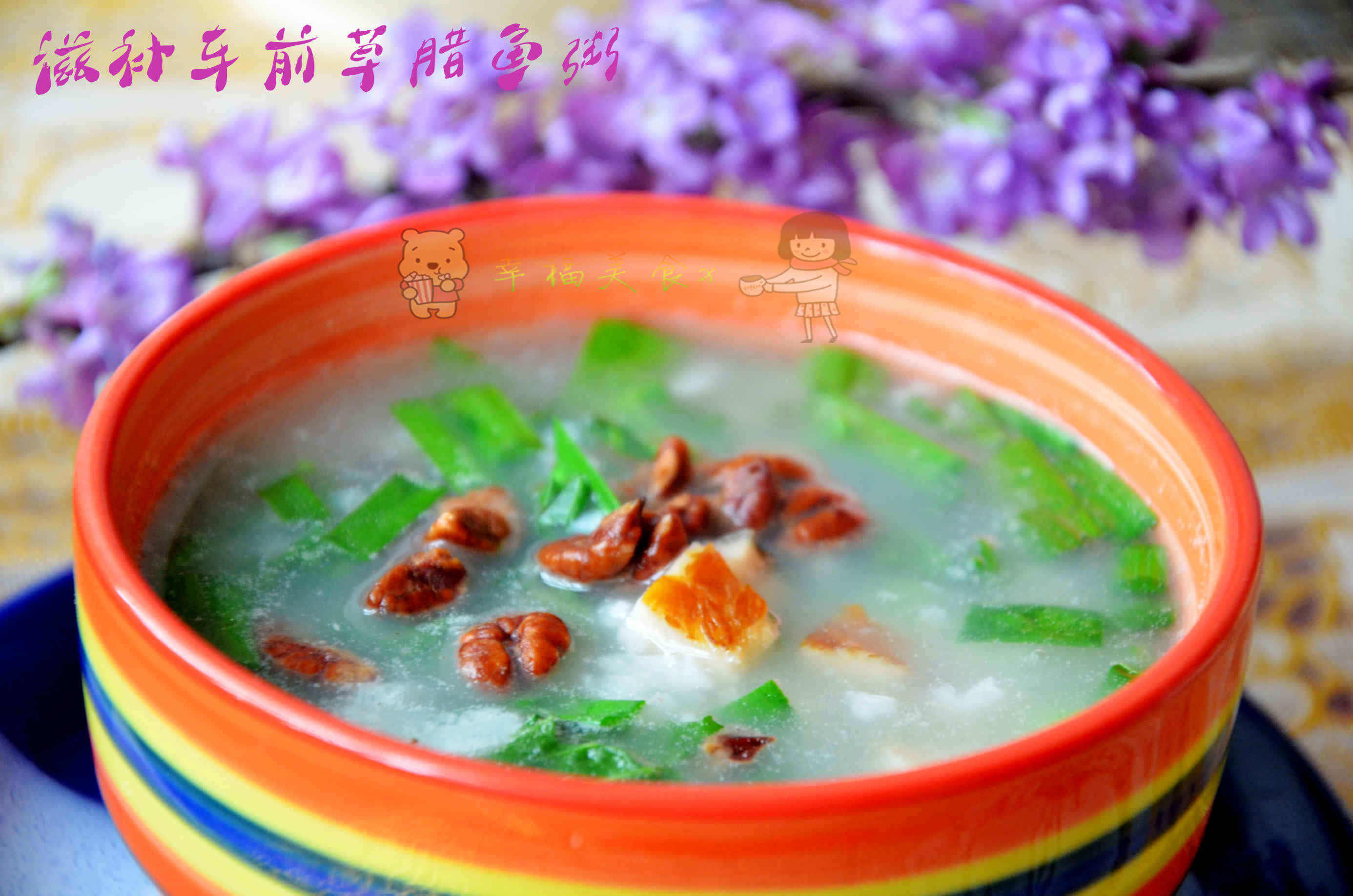 幸福小贴士:1、白米粥也可以换成黑米粥和八宝粥等,虽然口感能发生变化,但效果会更好。2、车前草提前烫一下可以去除部分苦涩味。3、山核桃仁因为是熟制品,所以不用提前加入,以免吸收水分影响口感。