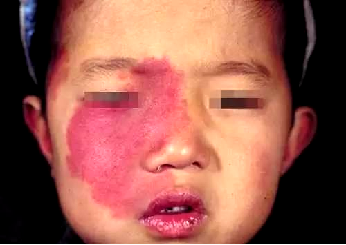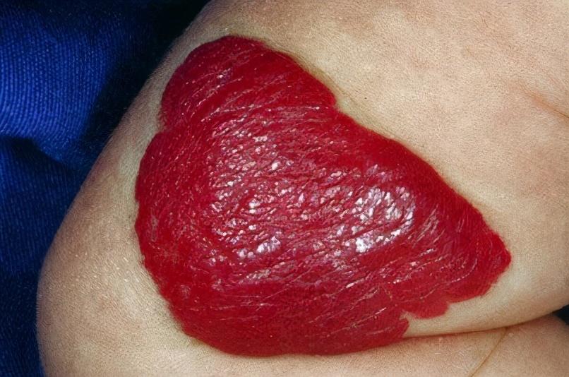 又叫草莓状血管瘤,表现为鲜红色、柔软、分叶状血管肿瘤,压之不褪色。头颈部多见,通常在出生后数周/数月内出现,生长迅速,大多在1岁以内长至最大,以后可自行退化。