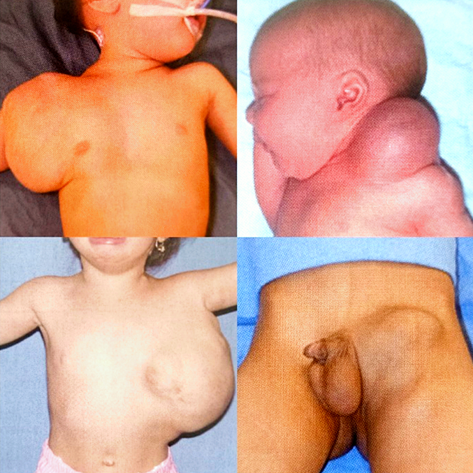 主要由扩张的淋巴管组成,可分为微囊型和巨囊型,内部充满淋巴液。微囊型表现为隆起于皮肤的质韧包块,边界不清;累及皮肤浅层或粘膜的病变可表现为表面有多个淡黄色或淡红色水泡,或青紫色改变。巨囊型表现为肿块凸起于皮肤,边界清晰,皮肤颜色变化不明显。淋巴管畸形可伴有囊内出血,导致体积突然增大。