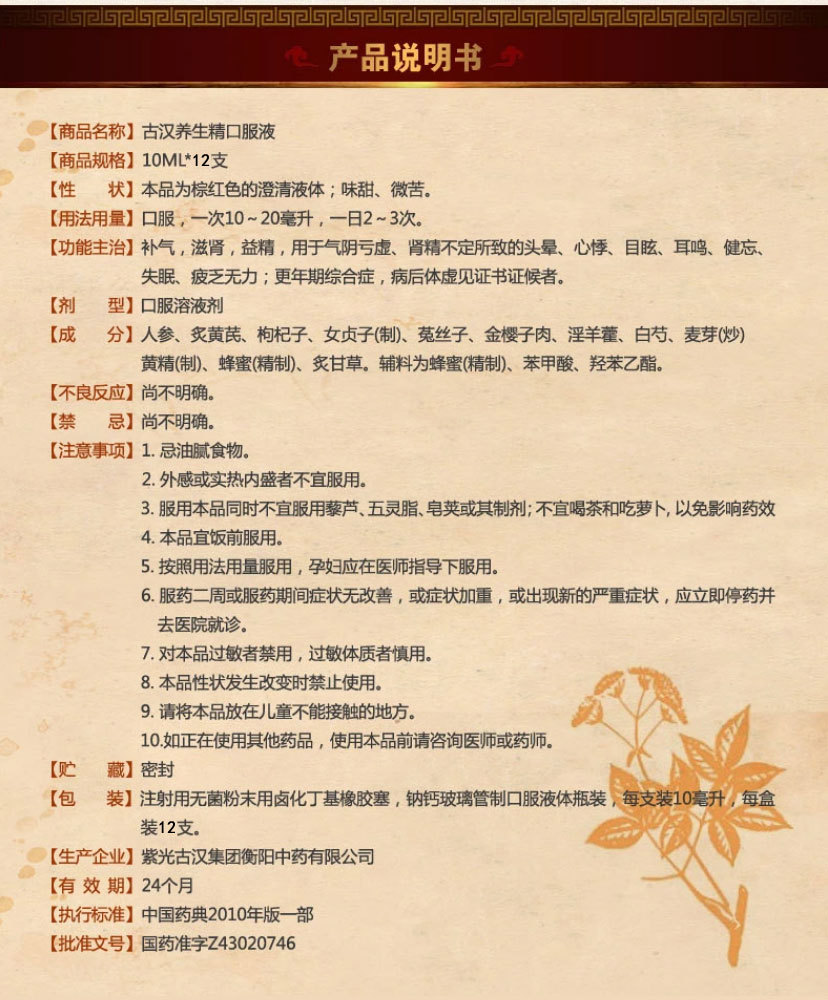 在湖南,有种按照长沙马王堆汉墓出土的两千年前传奇秘方——《养生方》生产的“神药”可谓家喻户晓,千千万万的人为之倾倒。吃了它,常年失眠的睡得安稳了,腰酸腿痛的全身有劲了,面色憔悴的变得红润了,尿频尿不尽的不再滴滴嗒嗒了,夫妻不和的感情和谐了。更为神奇的是,长年服用的人,有的白发转黑了,有的长年不愈的疾病突然好了,有的变得越来越年轻了。这并不是神话,而是现实生活中上演的真实事迹。它就是“中华养生瑰宝”——古汉养生精。