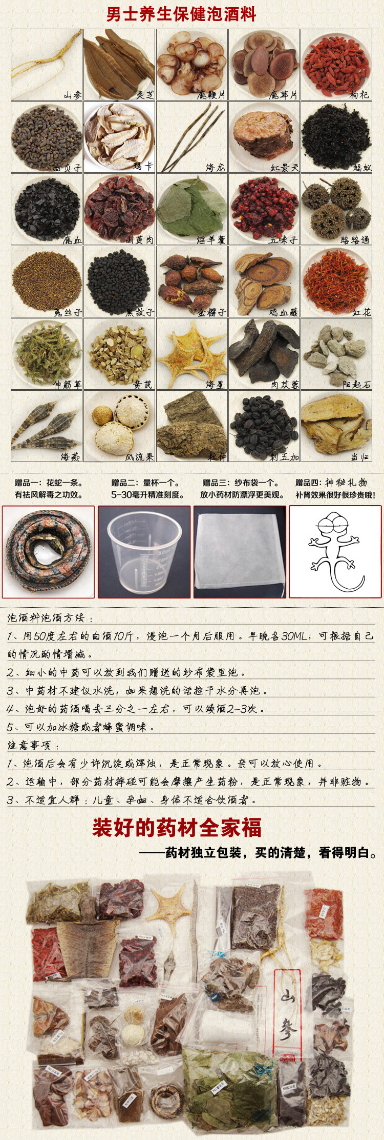 原料:肉苁蓉,淫羊藿,补骨脂,公丁香,花椒,杜仲,白芍,牛膝,当归,红花,生地,熟地,枸杞子,白术,砂仁,党参,茯苓,甘草,木香,菊花,地骨皮,五加皮,苍术,豆蔻,酒等。