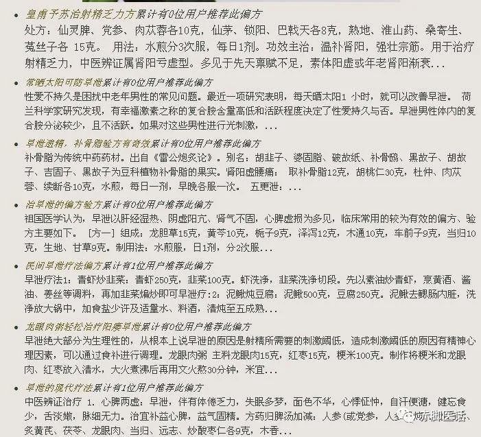 隔壁村里有之前有一个80多岁的老中医,在我们那挺有名气的,据说他师傅之前宫里的御医。十里八乡的人都找他看过病,尤其是那些备孕的小夫妻,婆婆都会去讨个药方回来给自家儿媳妇补。我前几年有频繁手淫的习惯就把自己搞成了早泄。然后去找那个老医生看,然后他就给我开了药方调理,我记得里面有五味子、枸杞啥的,让我先调理一段时间,说是对肾好的,然后说调理之后还有一个百交不泄的药方是浸泡后后外涂的,要等调理好身体之后在找他,结果我服用了一段时间去找他,才得知老人家不在了,我特别想知道百交不泄秘方一味药到底是哪一味可以帮助我彻底治好早泄?