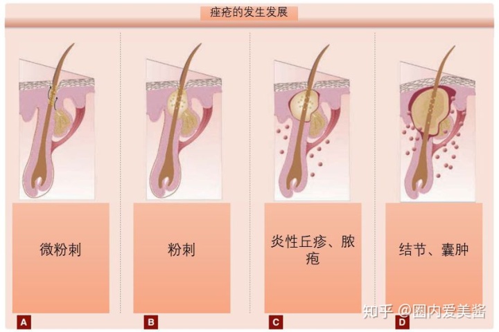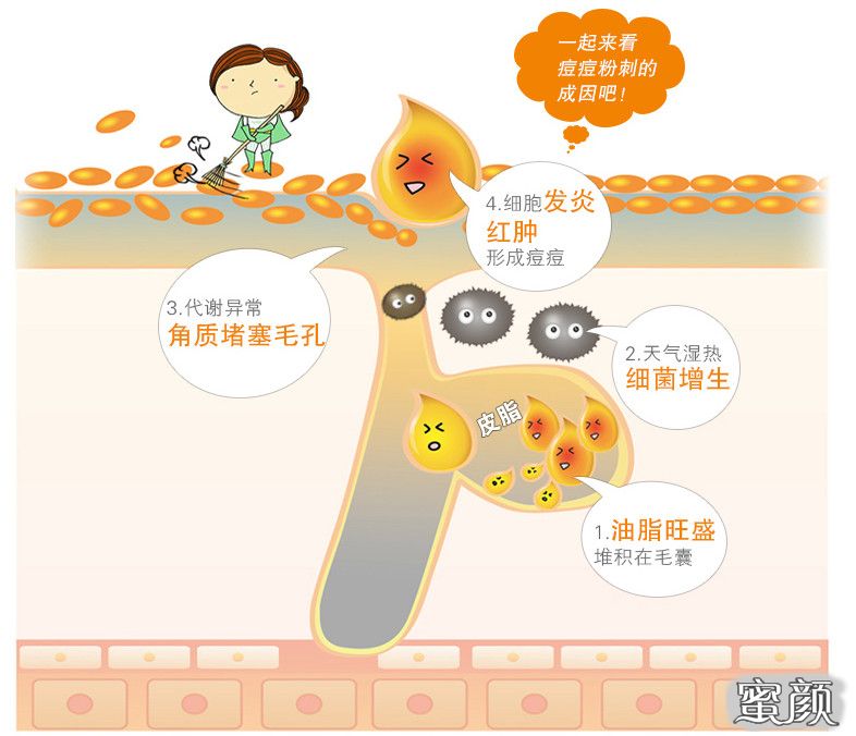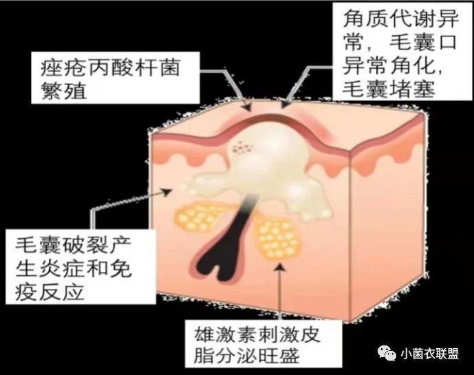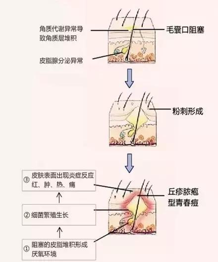 三是皮脂比例失调:主要是不饱和脂肪酸和腊脂的比例失调使皮脂粘稠度增高排出不畅,聚积在毛囊内;