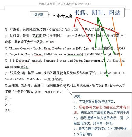8.参考文献:在毕业论文末尾要列出在论文中参考过的所有专著、论文及其他资料,所列参考文献可以按文中参考或引证的先后顺序排列,也可以按照音序排列(正文中则采用相应的哈佛式参考文献标注而不出现序号)。