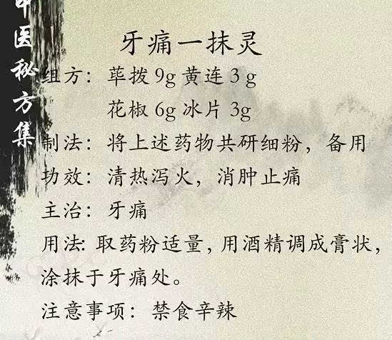 (一)用筷子蘸一点味精,然后将味精点到疼痛的牙齿上,疼痛将即刻好转并很快消失。
