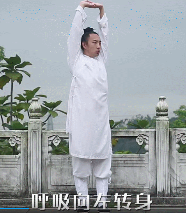 第三步:呼气转身,左手下,右手上,转回原位,依次左右旋转重复三次。