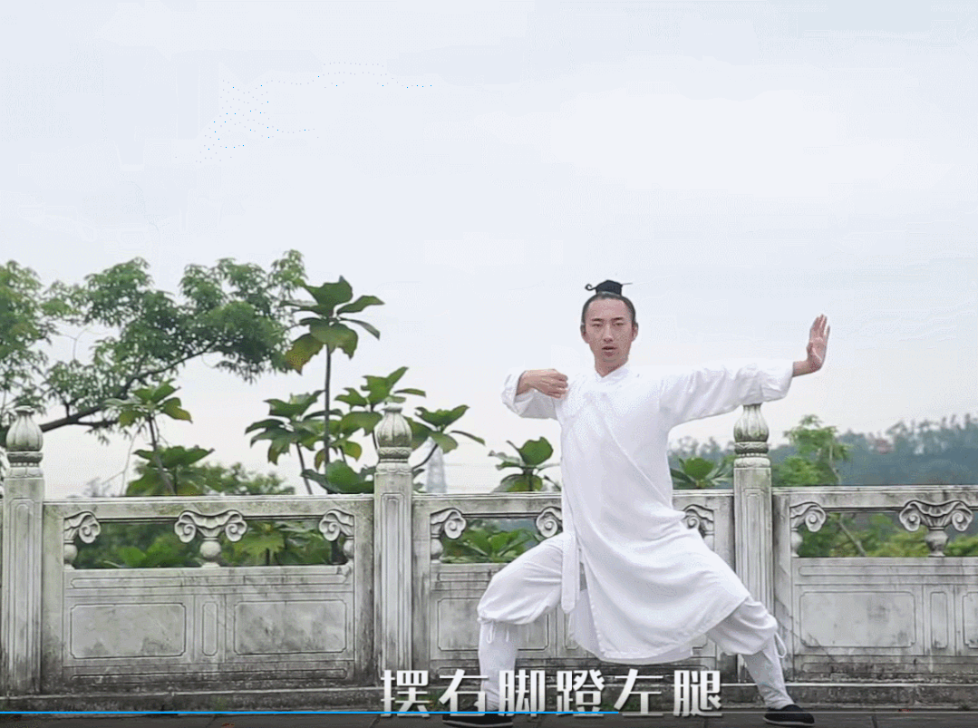 第四步:第3次开弓时,摆右脚蹬左腿,左手伸直,右手变掌,攒拳,吸气开弓,呼气穿掌,重复2次。