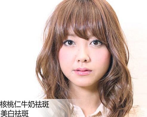 核桃仁牛奶祛斑:核桃仁,牛乳,豆浆,黑芝麻 。将核桃仁、黑芝麻放小磨中磨碎,与牛奶、豆浆调匀,放入锅中煮沸,再加白糖适量,每日早晚各吃1小碗,可以美白祛斑。适用于皮肤黄褐斑及皱纹皮肤。