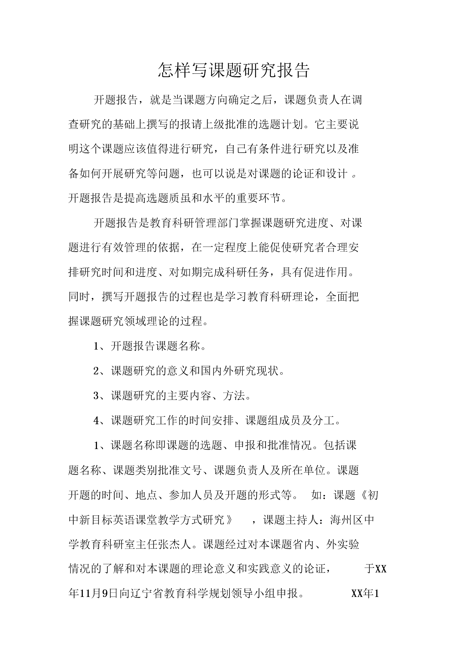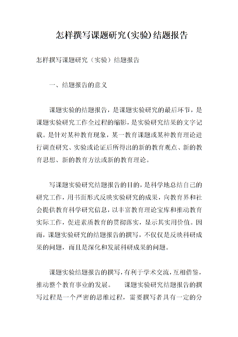 也可以谈对学生、教师、学校所产生的影响。4、课题研究成果的应用推广设想三、研究报告的撰写课题研究报告是一种专门用于科研课题结题验收的实用性报告类文体。是研究者在课题研究结束后对科研课题研究过程和研究成果进行客观、全面、实事求是的描述、分析与总结,是课题研究所有材料中最主要的材料,也是科研课题结题验收的主要依据。课题组在提交结题申请前,应先对结题材料进行充分准备,特别是研究报告的撰写。结题报告要回答的三个问题:一是“为什么要做这项研究?”即这项课题是在怎样的背景下提出来的,研究这项课题有什么理论意义和现实意义。二是“这项研究是怎样开展的?”要着重讲清研究的理论依据、目标、内容、方法、步骤,讲清研究的主要过程。三是“这项研究取得哪些研究成果?”其中“课题研究成果”是整篇结题报告中最为重要的部分。从教育教学理论与实践两方面简述课题研究的背景、价值、实践意义,以及在国内外同类研究中所处的水平。这部分主要回答上面提出的第一个问题“为什么要做这项研究?”课题研究的目标:结题鉴定的主要依据是课题研究有没有完成预定的研究目标。因此,课题研究报告应围绕研究目标的达成来展开。课题研究的主要内容陈述的是课题研究的范畴,课题研究的着力点。
