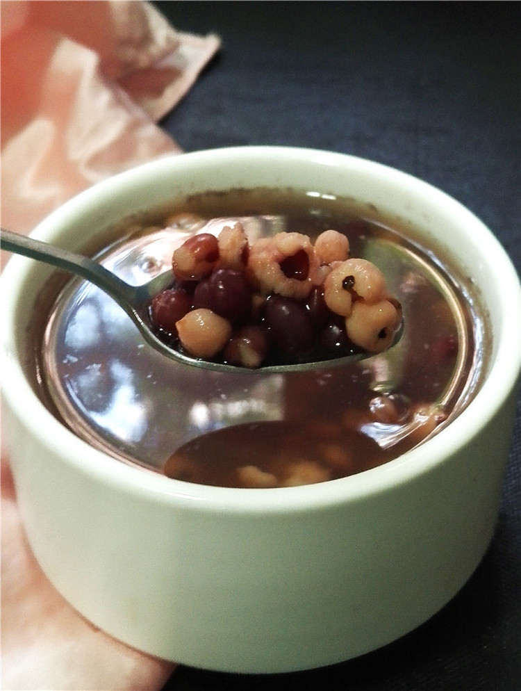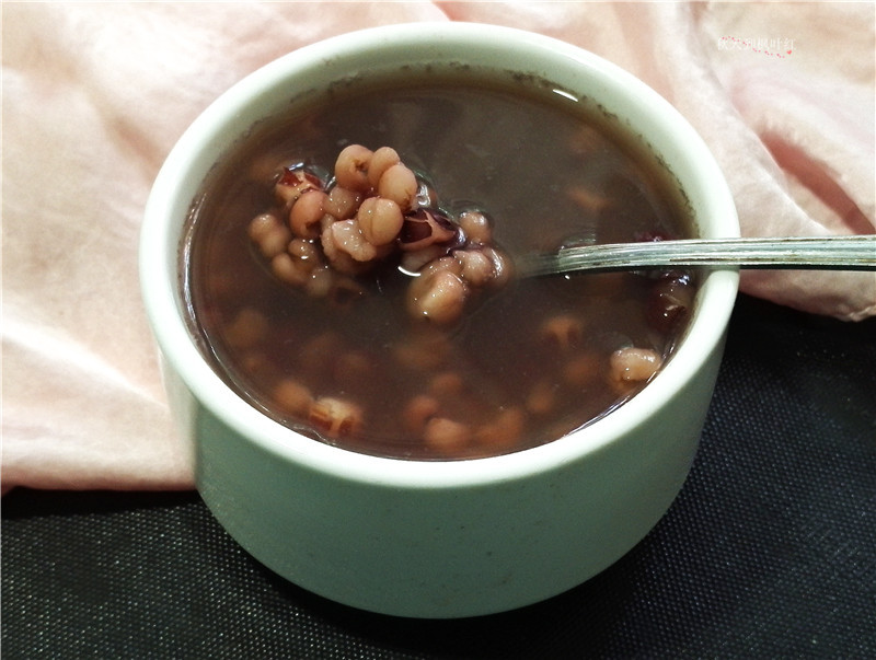 熬粥时候,水放多一些,这些汤就够我们喝一天,可以当茶喝.薏米,在中药里称薏苡仁,《神农本草经》将其列为上品,它可以治湿痹,利肠胃、消水肿、健脾益胃,久服轻身益气.红小豆,在中药里称作为赤小豆,也有明显的利水、消肿、健脾胃之功效,因为它是红色的,红色入心,因此它还能补心.
