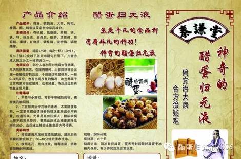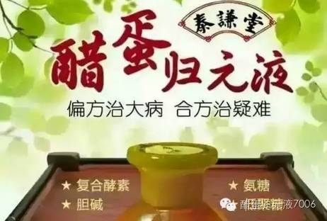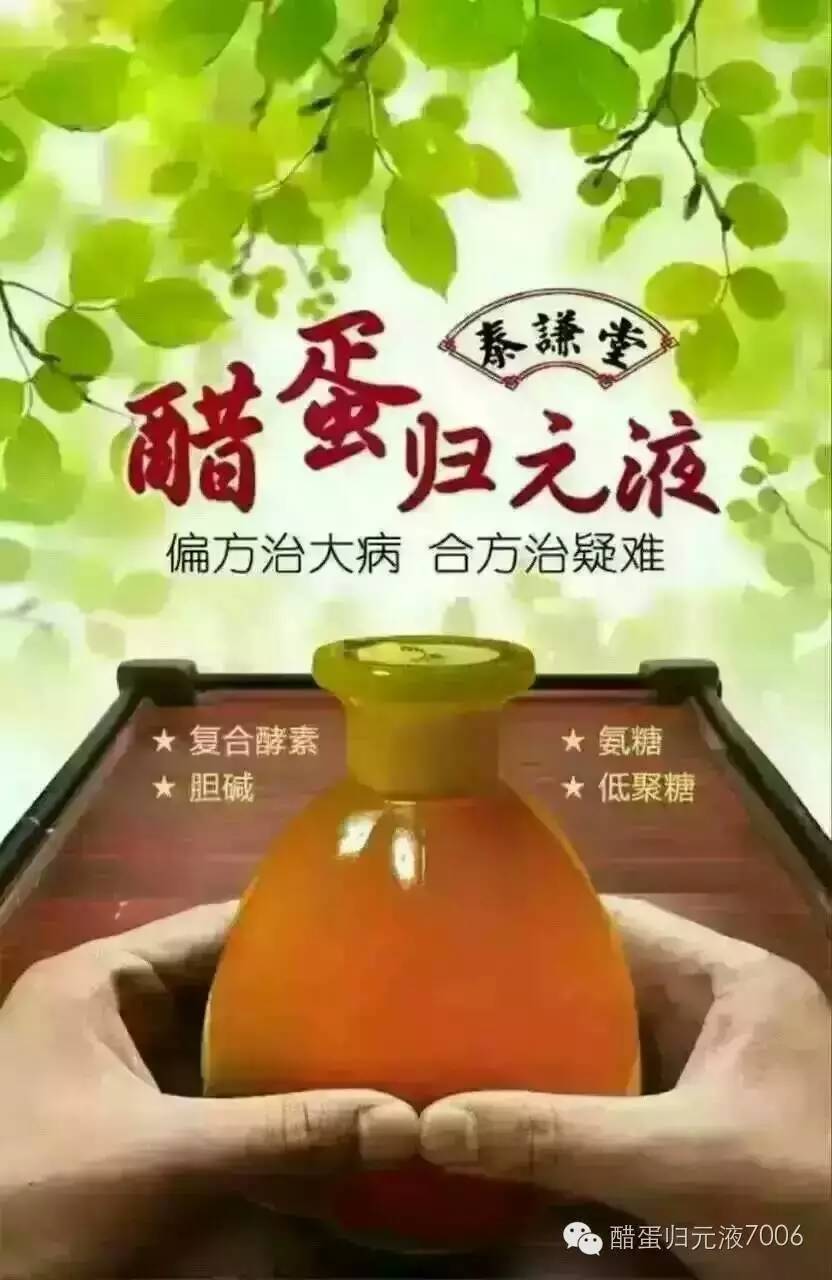 醋蛋归元液,不是药也不是保健品,是食疗偏方,动植物复合酵素!既具有保健品的功效又有药品的疗效!没有任何毒副作用!保健品、药品做不到的它可以做到,20分钟迅速到达骨髓!千年传承,万人验证了她的神奇功效。