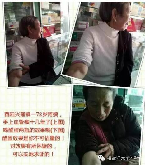 重庆市酉阳县兴隆镇曾经兴隆镇老区长的妻子72岁, 右手肘内侧有一鸡蛋大的血管瘤 十几年了,喝醋蛋2瓶后小了很多 ,醋蛋液实在太神奇了。(李晓红医生分享)