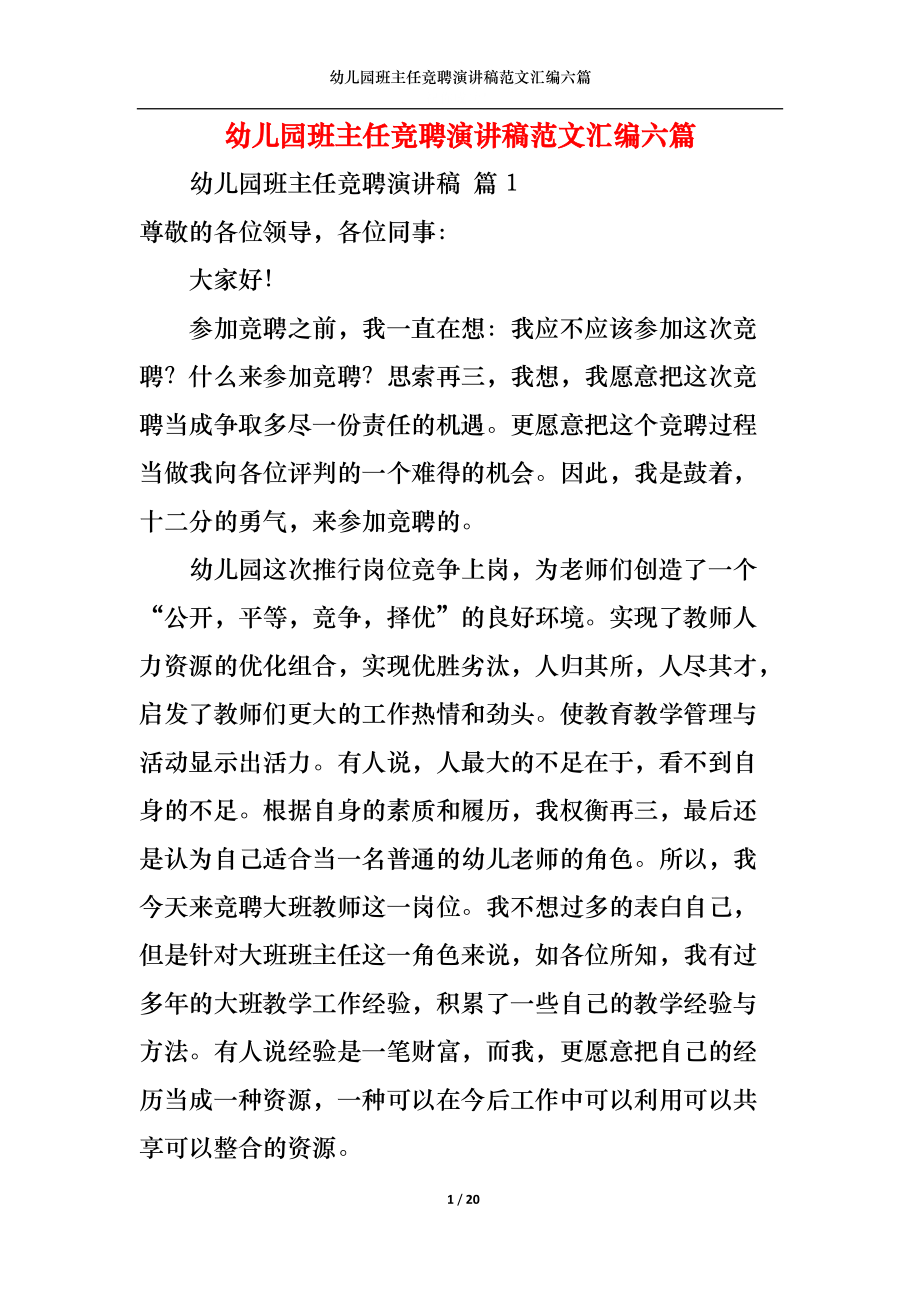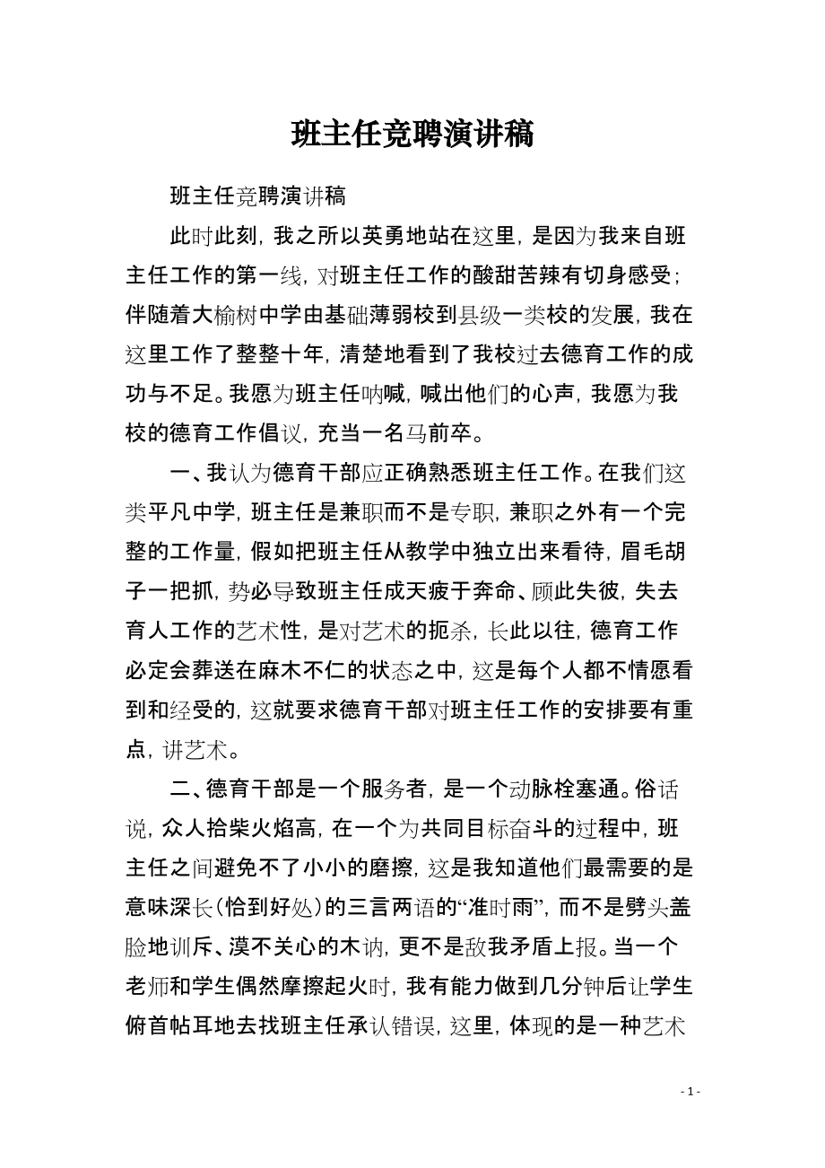 大家好!我愿意把这次班主任竞聘演讲当成争取多尽一份责任的机遇。更愿意把这个竞聘过程当做我向各位评判的一个难得的机会。因此,我是鼓着,十二分的勇气,来参加竞聘的。