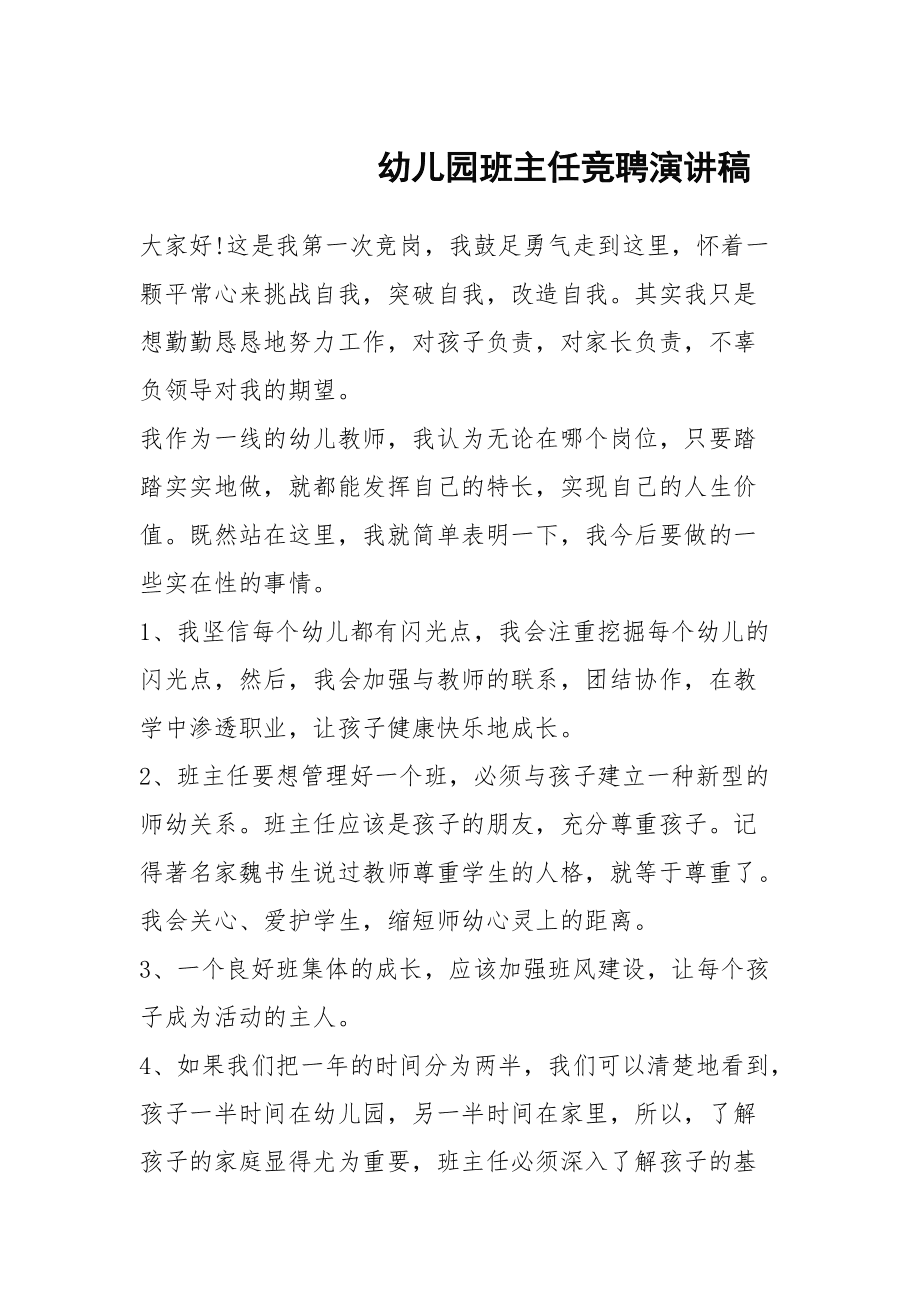 在xx幼儿园工作的x年里,我体会到了从事这份工作的责任和光荣,也体会到了其中的艰辛和不易,更为能够在这个队伍中一天天成长起来、成熟起来而感到自豪。俗话说“人生百年,立于幼学”,幼儿教育素来被称为“向下扎根的教育”,这句话十分生动地描绘了幼儿教育在人的终生发展中的地位。孩子如同一棵棵嫩绿的幼苗,需要我们去呵护、去浇灌。所以,今天我想竞争班主任,一是为了更好的锻炼自己,二是更好地服务于幼儿教育事业。