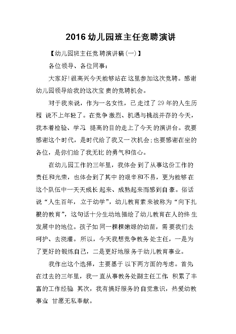 今天我竞聘的岗位是幼儿园正班主任,之所以竞聘这个岗位,我认为具有以下的几个优势: