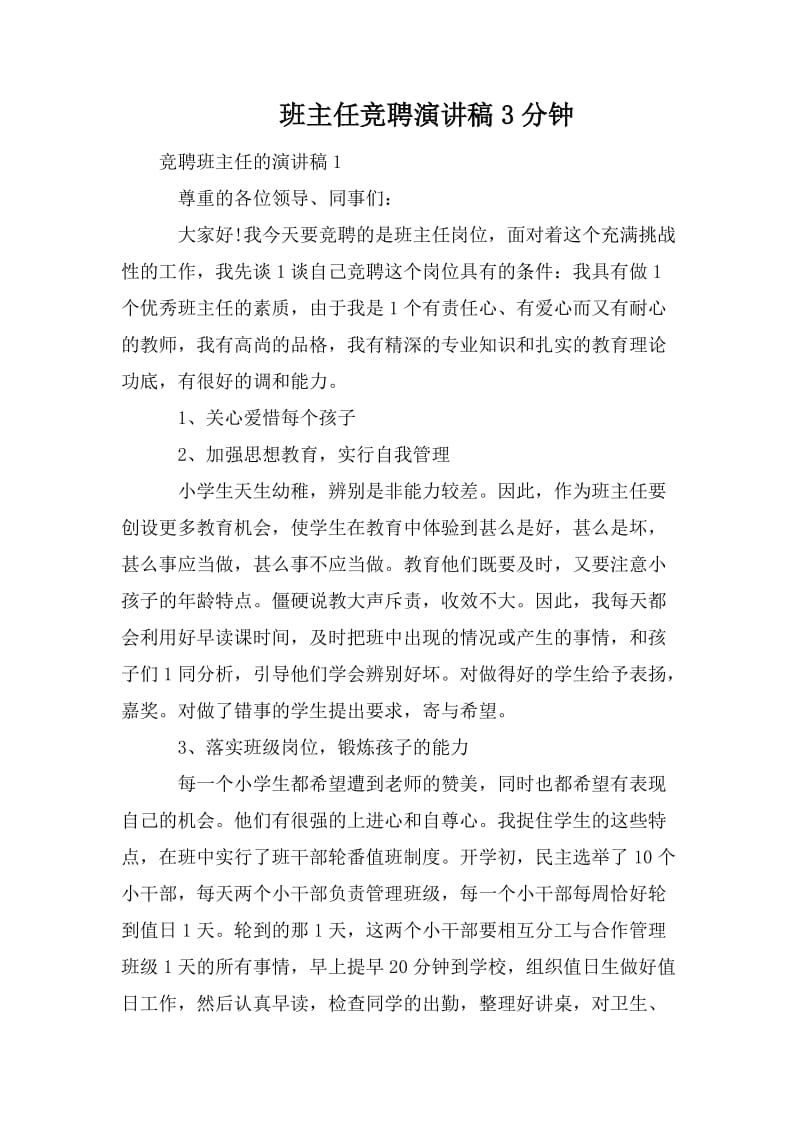 首先感谢组织上给我这样一次机会参加竞争上岗。对我个人来讲,我想这不仅是一次竞争,更是一次对自己的检验、学习和锻炼。下面我就把自己竞争班主任的一些想法,向各位领导和同志们汇报一下。
