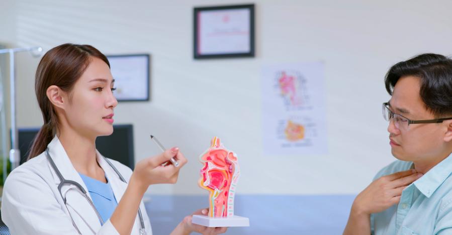 如果胃食管内的食物向上反流至咽喉部,就会对黏膜造成物理性和化学性刺激,引起咽部异物感、恶心干呕等一系列慢性咽炎的症状。