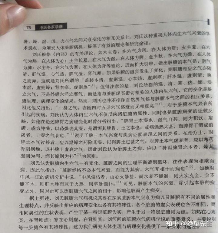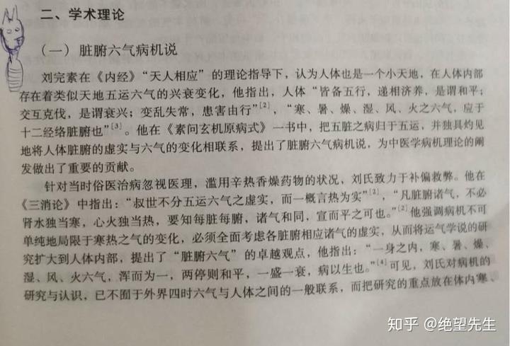 到目前为止,这些气都还可以用“自然之气”一个定义来概括。直到金元时期出现了一个刘完素。刘完素提出人体内也有六气,会影响。这个老前辈的书我是没看过,所有对他的了解出自这本教科书——《中医各家学说》。截图: