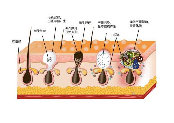 当毛囊被皮脂腺分泌物眼皮肤死皮细胞混合堵塞后,油价就会在此积聚,而皮肤上的细菌亦会在这个地方高速繁殖,导致在真皮部分产生脓包、小疙瘩,并在这些地方周围变得红肿。
