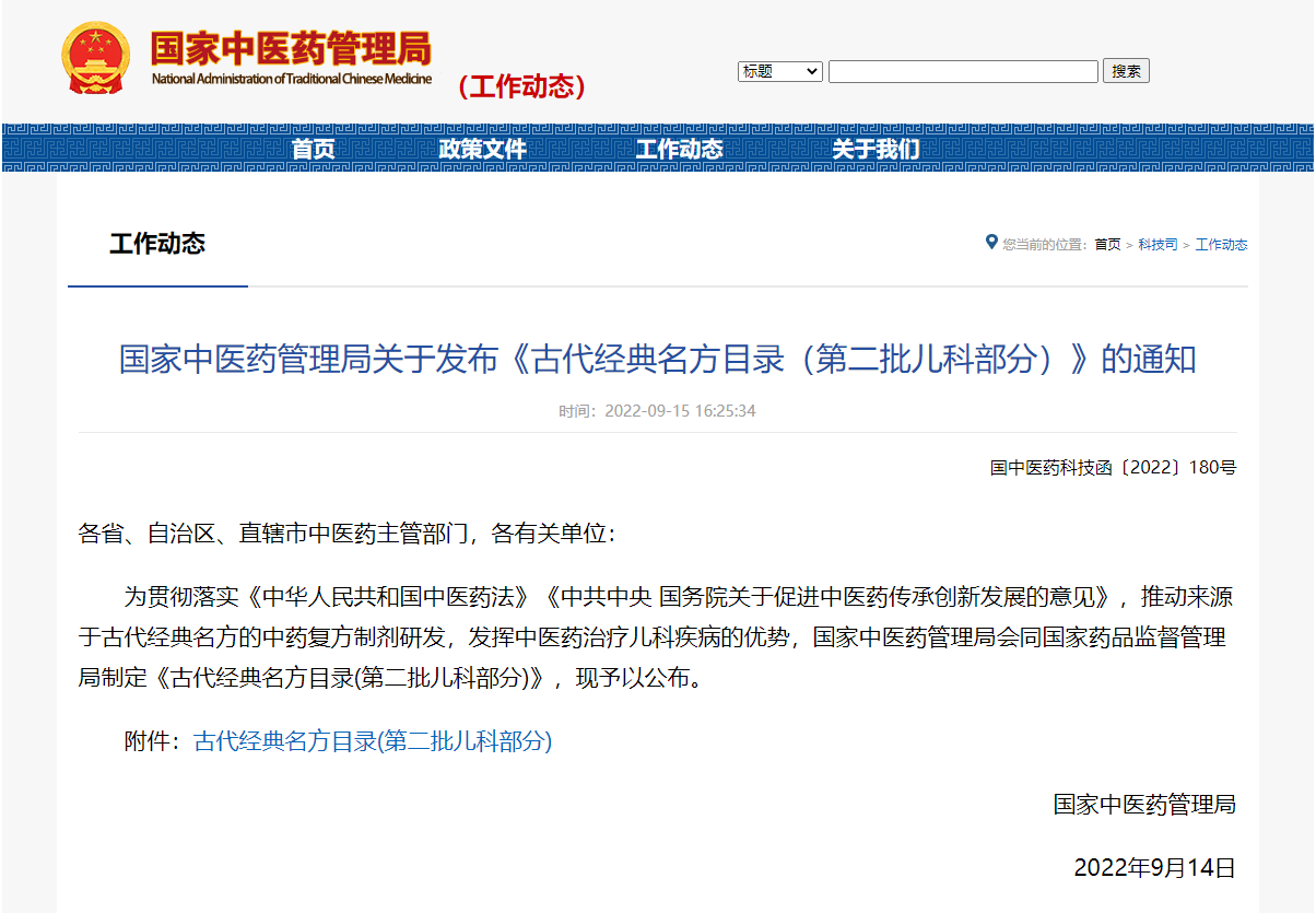 2022年9月15日,国家中医药管理局会同国家药品监督管理局制定并公布了《古代经典名方目录(第二批儿科部分)》,旨在推动来源于古代经典名方的中药复方制剂研发,发挥中医药治疗儿科疾病的优势。