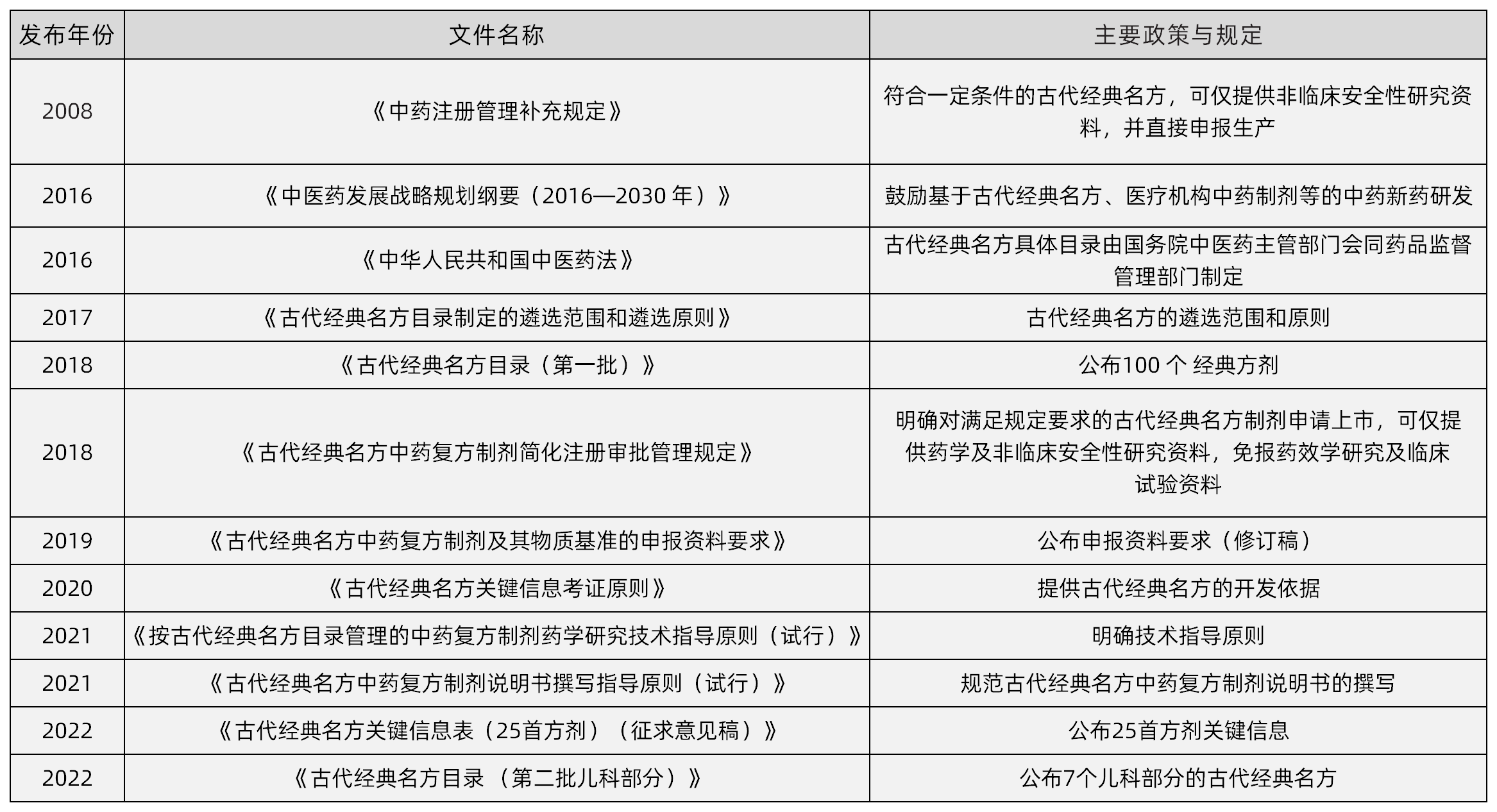 为了更好的传承好、发展好、利用好中医药,尤其对于古代中药经典名方的开发,国家相关部门密集研究出台了系列法规政策。这些政策对于古代经典名方开发利用具有里程碑式意义,为古代经典名方产品的研发开展绿色通道,从而引导和促进其稳定快速发展。
