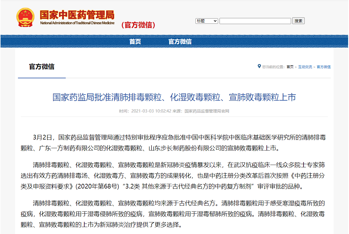 在抗击新型冠状病毒肺炎疫情过程中,基于古代经典名方化裁而来的清肺排毒汤作为全国投放量最大的方药发挥了重要作用,取得了显著的疗效,并有广泛基于人用经验的临床证据。2021年3月2日,国家药品监督管理局通过特别审批程序应急批准中国中医科学院中医临床基础医学研究所的清肺排毒颗粒上市。
