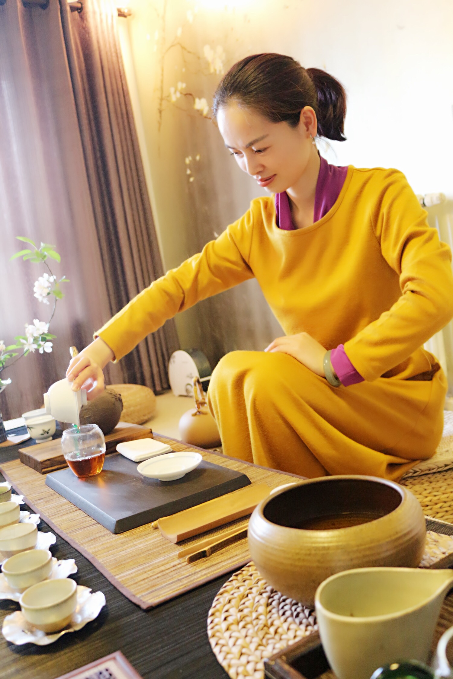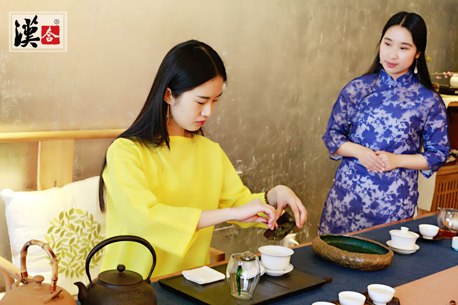 茶室门口放有一个石臼, 里面盛满清水,客人须在此洗手。茶室的入口处装着3 尺高的格子门,大家都得弯腰才能进 去。据说,这样可教人处世时要谦虚谨慎,不可自高自大。茶室里的布置也很讲究,除了桌、 椅、茶几处,在墙上还挂有名家的字画,旁边还摆着典雅的插花,加上那些粗糙厚重、涂有 或橙色或浓黑色彩釉的茶具,使你一踏进这里,就会充分享受到那种浓郁的古色古香的气氛。 接着,茶会开始,主客寒暄后,主人按一定程序,点燃炭火,煮开水。这期间,主人还要献 上根据节令精心制作的点心。因为茶稍带苦味,饮前吃上这种点心,会使人感到茶清香可口, 别有一番滋味。水开后,开始冲茶。主人将冲好的茶,一碗碗从首席开始依次献给客人。客 人则按规定恭敬地双手接茶、三转茶碗、轻品、慢饮,饮时要发出吸气的吱吱声,表示由衷 赞赏主人的好茶。茶饮毕,还要观赏茶具,然后将茶碗奉还主人,再接着饮。席间,客人要 说分寸得体的颂词,赞扬主人茶具或赞扬主人品德。主人则要客气一番表示感谢。主客之间 还可以互相谈些有关茶道方面的新闻及感谢之辞,最后互祝身体健康,事业顺利。这时,茶 道仪式一般就结束了,客人们向主人致谢,跪拜而别,主人则热情洋溢拜谢,将客人送至门 外告别。