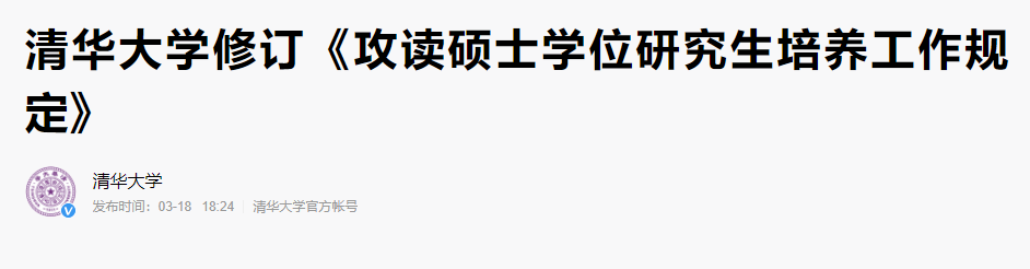 3月18日,清华大学公布了2020至2021学年度第9次校务会议修订的《攻读硕士学位研究生培养工作规定》, 明确提出不把发表学术论文作为申请学位论文答辩或申请学位的前置条件。